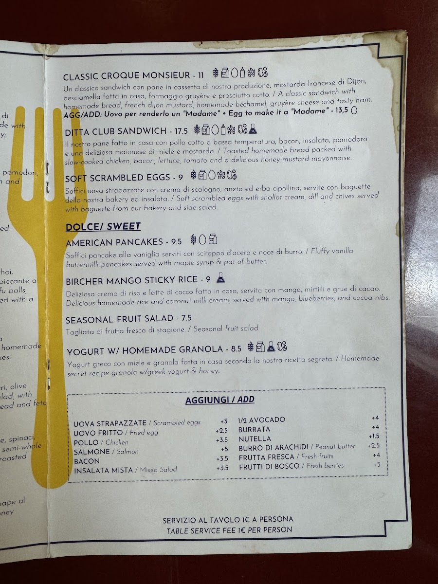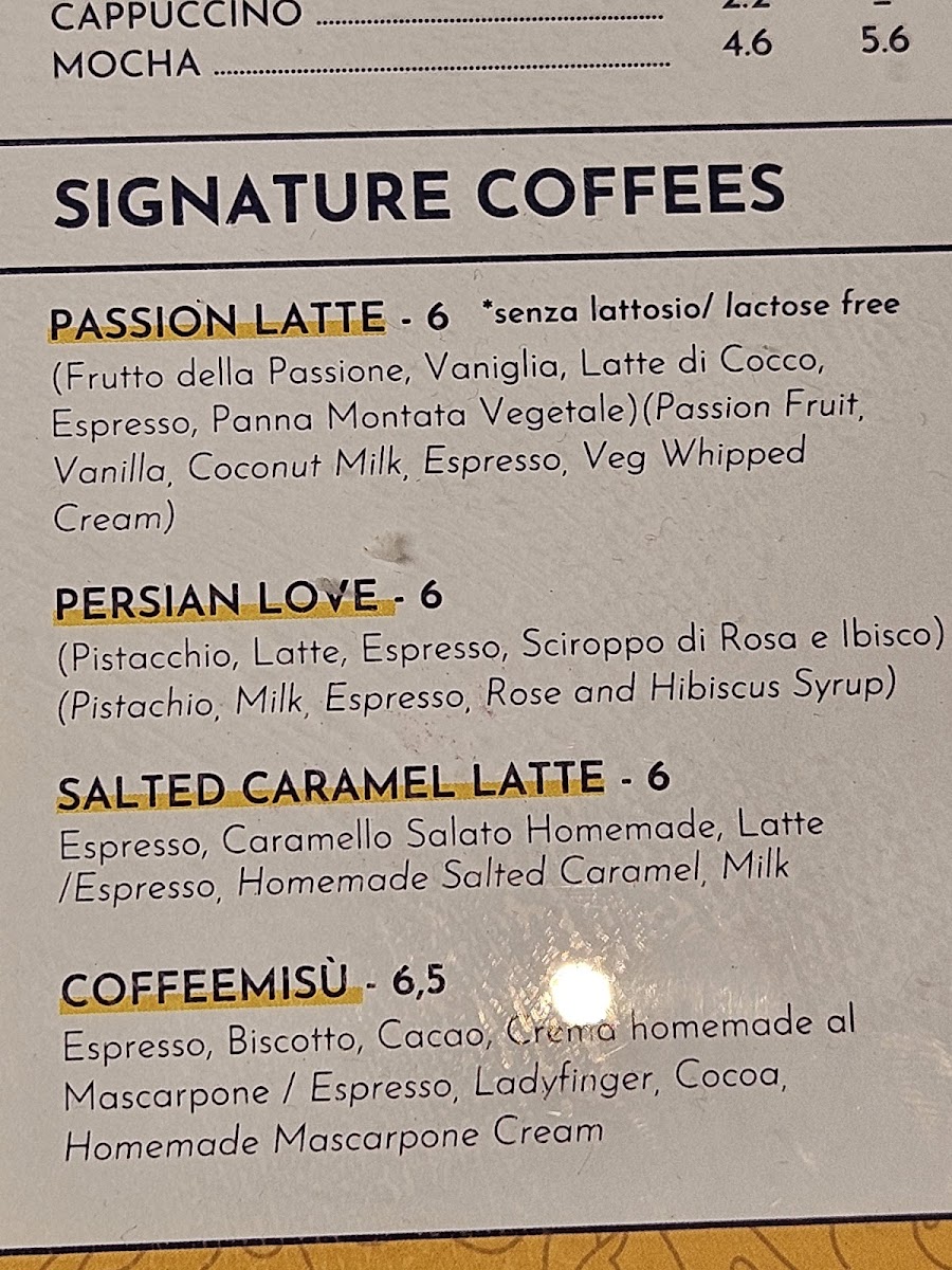 The menu at Ditta Artigianale Via dello Sprone offers a variety of specialty coffees alongside breakfast and brunch options. Visitors can find a selection of carefully prepared coffee beverages, including cappuccinos, lattes, and filter coffee methods such as V60. The food offerings feature breakfast staples like scrambled eggs and avocado toast, as well as light meals such as the Croque Madame and summer toast. Pastries and cookies are also available, complementing the coffee choices.